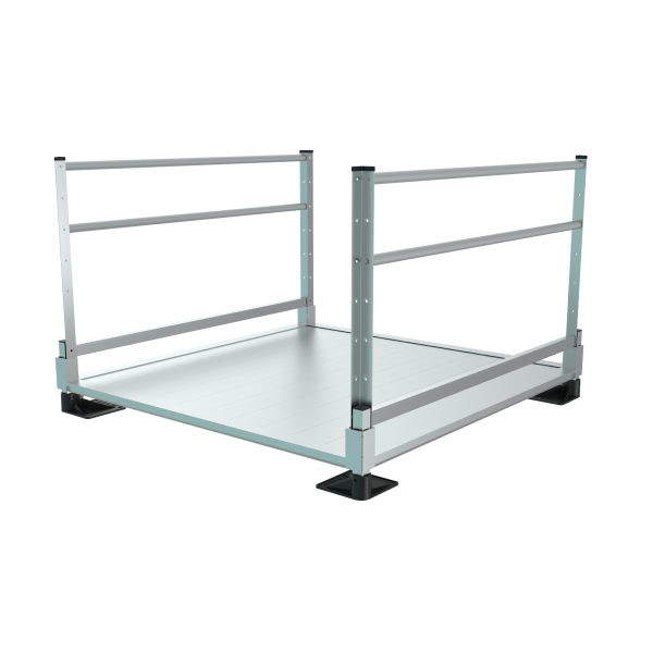 Serves the same purpose as our standard platform except this low profile version is designed for use with thresholds between 1-1/2” to 3-1/2” high. Available in multiple sizes and all handrail styles (shown with two-line rails).