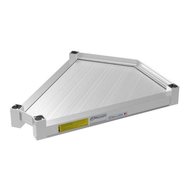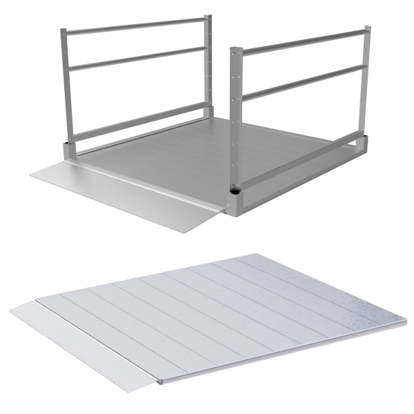 Provides a safe and solid landing at the bottom of a ramp run. Ideal for use when a ramp ends in the grass or other soft surface. The landing pad eliminates the need for pouring a concrete pad and is available with or without handrails. Ground transition options are also available.